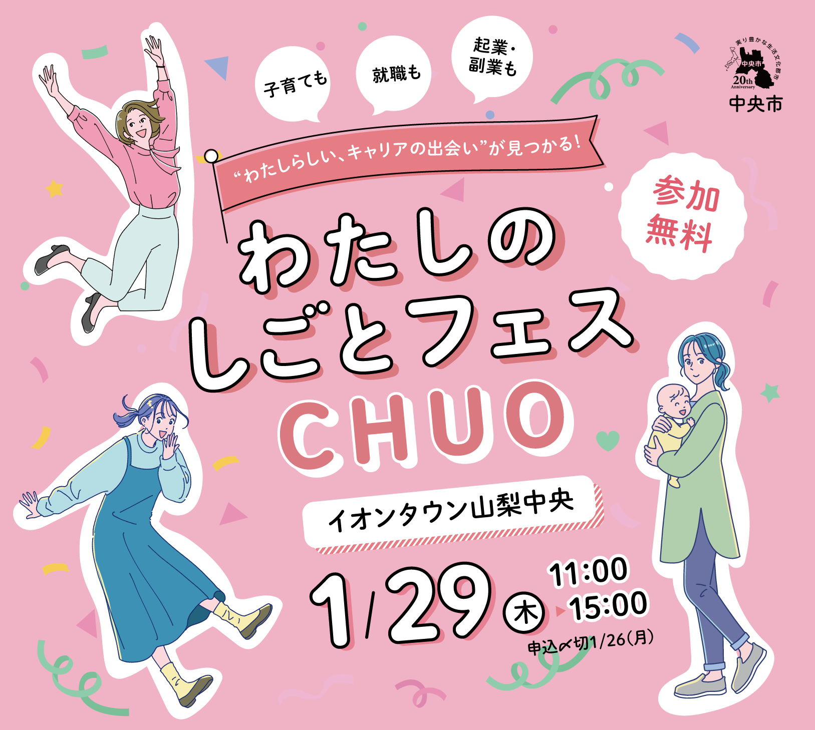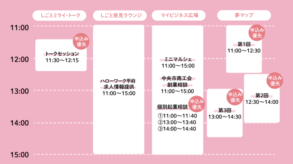 「しごと発見ラウンジ」「中央市商工会 創業相談」「山梨の女性起業家のミニマルシェ」は、当日参加OK(申込不要)です。